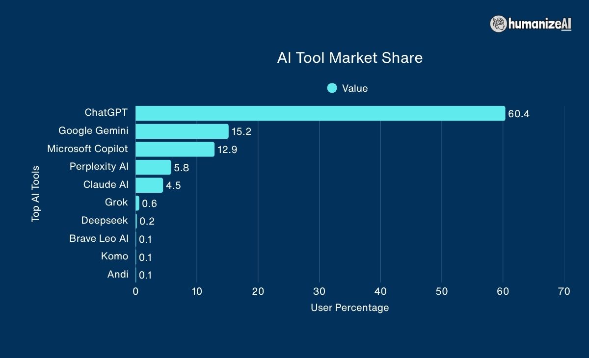 The study further highlights how it is slowly progressing towards having a significant market share. Here’s a quick look compared to other popular Generative AI tools: