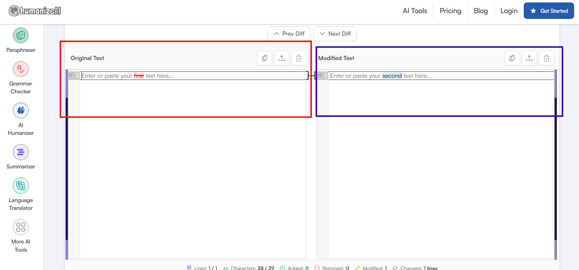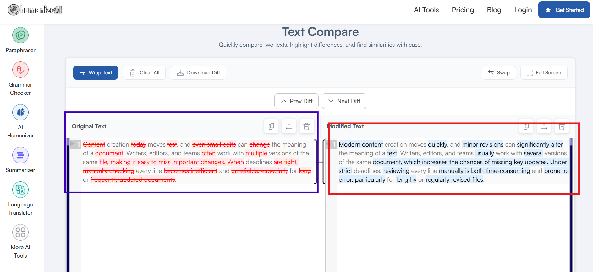 With HumanizeAI.io’s Text Compare, honestly, you are always one step ahead. Think about it this way, it is not everyday that you get a tool that lets you download all the highlighted changes in one dedicated report. Simply click on the Download Diff button, and you have all your changes marked and organized in one place.