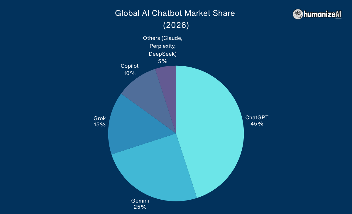 - Its market share also increased from 15% in early 2025 to nearly 25% by January 2026. (Making it the fastest-growing AI chatbot competitor.)