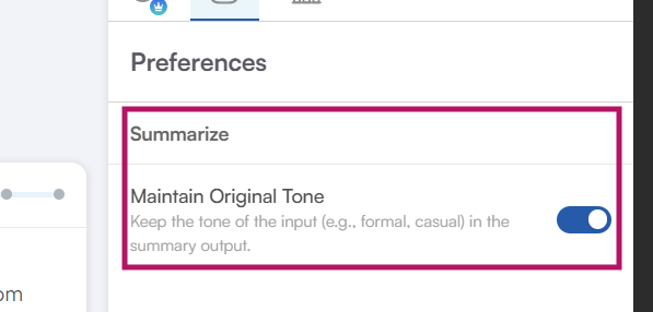 - Preferences: We had told earlier that with our tool, you get to control the tone and intended meaning of the given content. However, there is one more thing you can do to maintain the original tone for your generated results with a simple toggle.