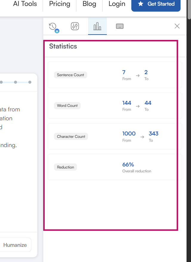 - Statistics: This is where things get interesting when you subscribe to the premium feature of our tool. You get a detailed report of your entire content even before you scan it for another read. Sentence Count, Character Count, Reduction, Word Count, you have it all in one dedicated place.
