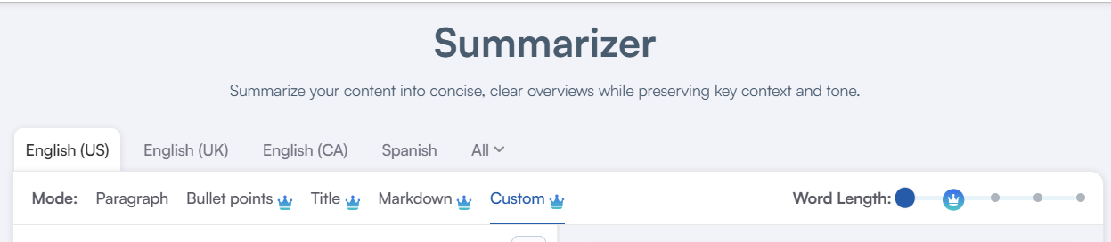 - Custom Mode: Even though it is an AI-powered setup, the ultimate control lies with you. With the Custom Mode, you get to personalize tone, length, and structure as per your writing needs. In other words, it lets you handcraft your summaries each time you use it without any added hassle.