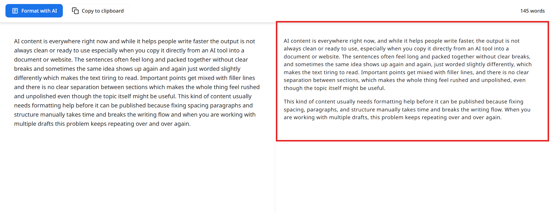- Some tools focus only on surface-level cleanup, such as fixing spacing or breaking text into a small number of paragraphs.