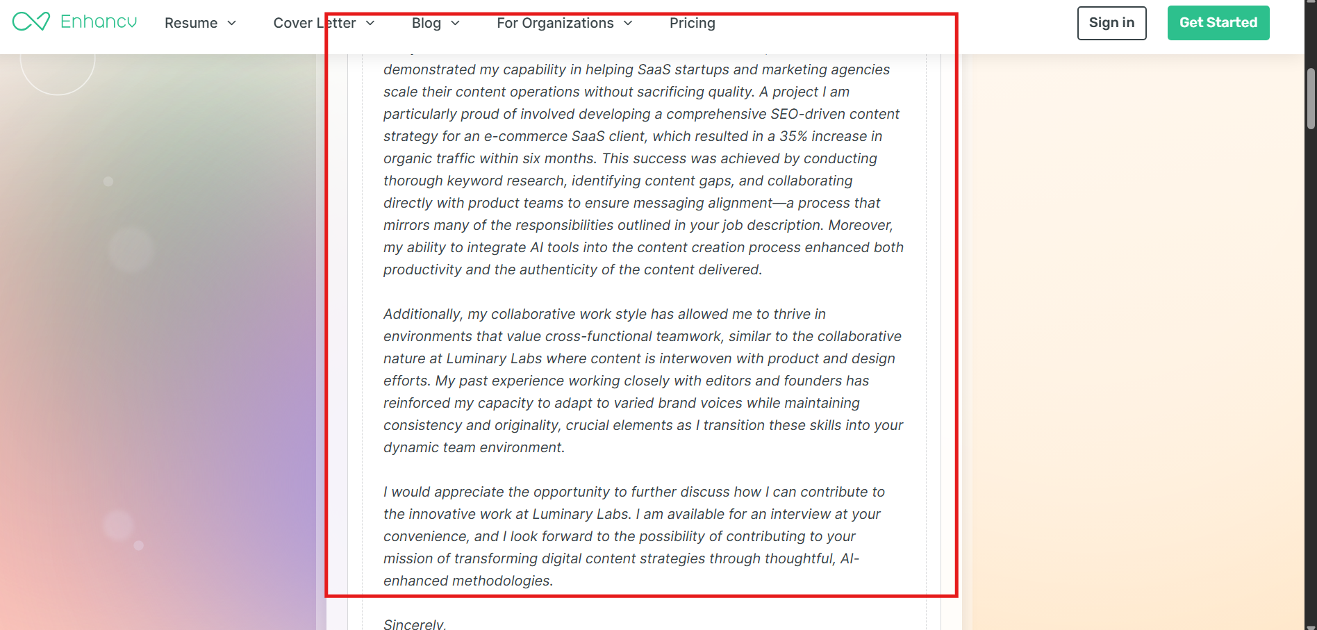 - Since it puts in next to no effort in adding layers to the generated results, it becomes very difficult for a candidate to stand out in the competition. The letter is packed with lines that sound impressive but say nothing, like “strong background in content strategy” or “commitment to innovation and excellence,” etc.