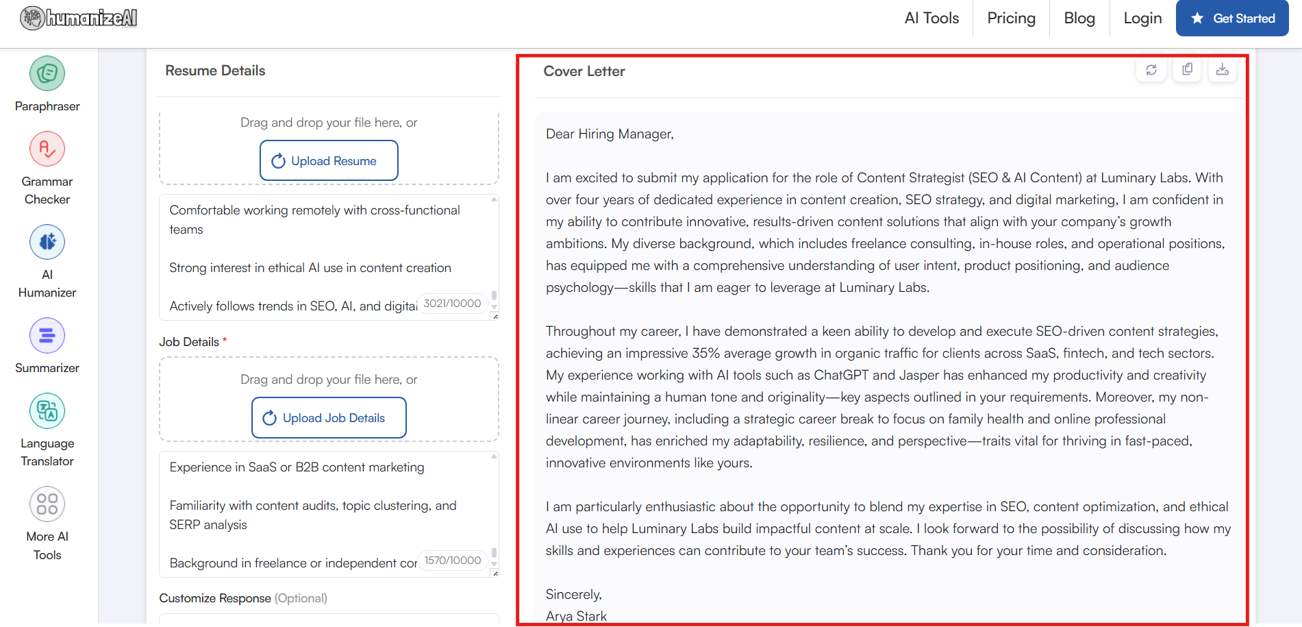 This is why the AI Cover Letter Generator by HumanizeAI.io stands out. Instead of overwhelming the reader with everything you have ever done, it prioritizes what truly matters for the role. Instead of sounding defensive or generic, it frames your journey with confidence and clarity. In other words in not only reads you but also understands how a recruiter scans the profile.