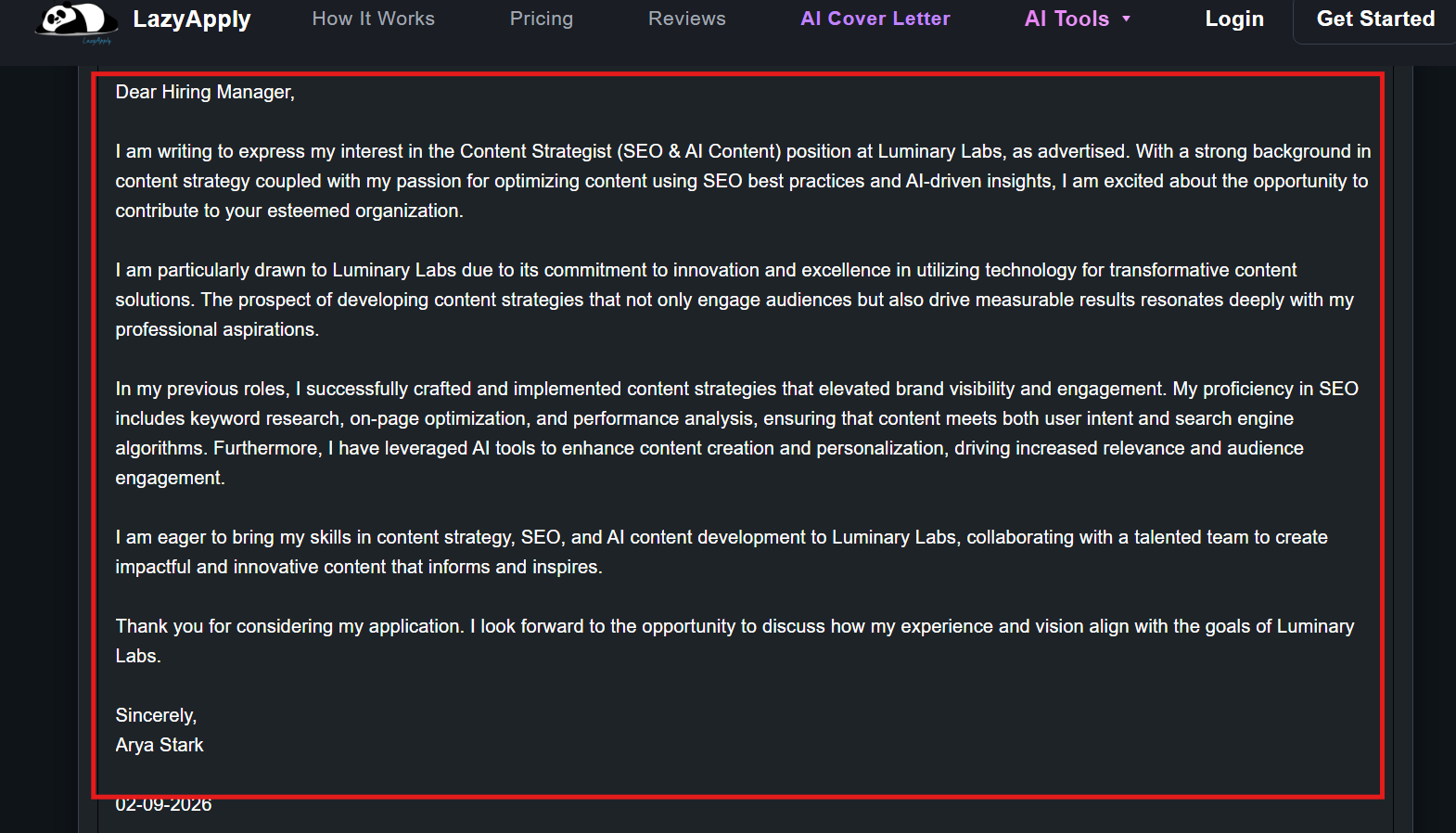 - The cover letter generated by LazyApply is clean and simple. However, this is also why it reads like a generic template and lacks that emotional appeal.