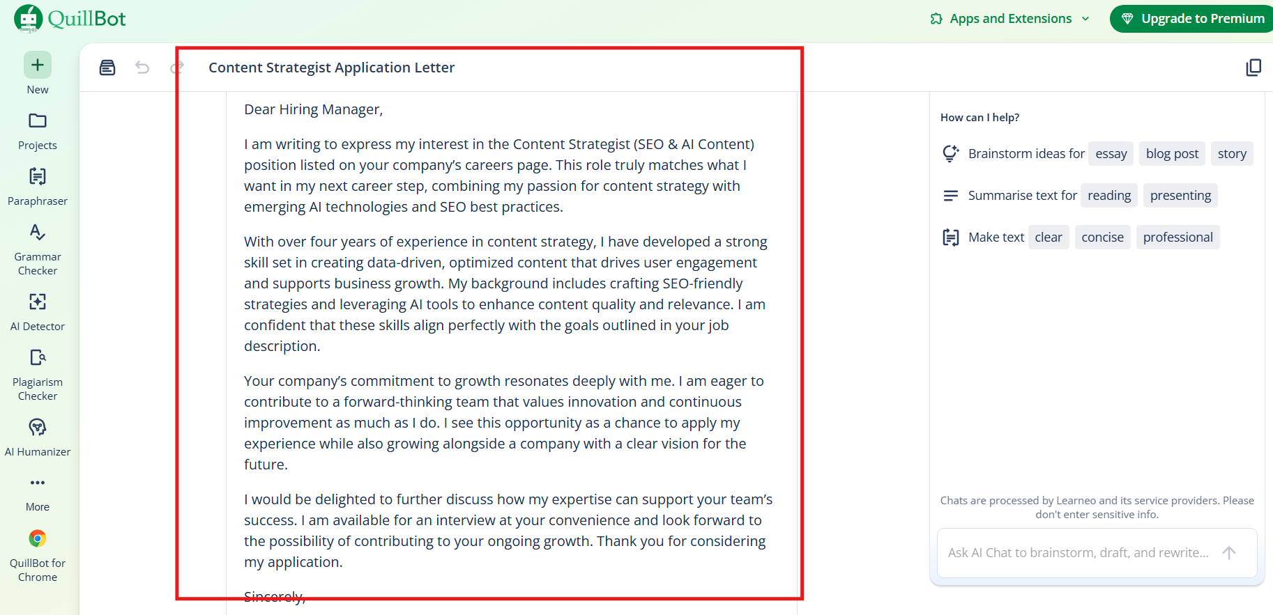 - With QuillBot, the situation is simple; it has great English but very little depth when it comes to a cover letter. Even though it has fewer buzzwords and the entire vibe is calm and elaborative, it lacks the precise or finer details.