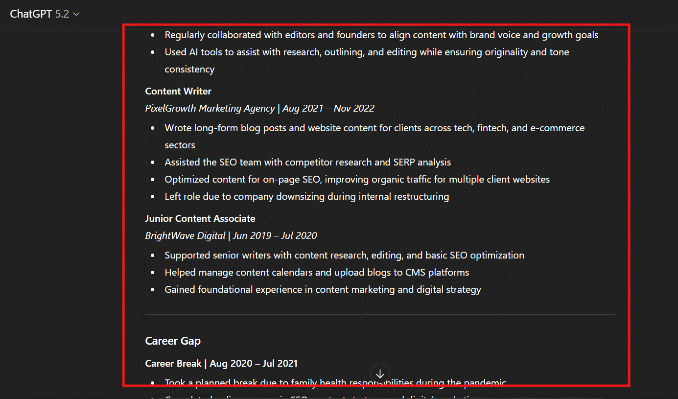 - However, it completely misses out on the career gap, the non-content/customer-facing role, and the freelance work. Statements like “align perfectly with the goals outlined in your job description” don’t refer to specific job responsibilities or how the candidate specifically matches the role.