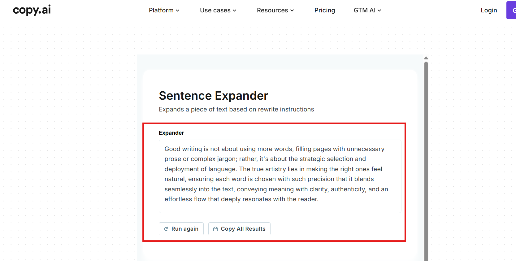 - AI Sentence Expander by Copy.ai also maintains the core message of the content and doesn’t shift towards a new narrative.