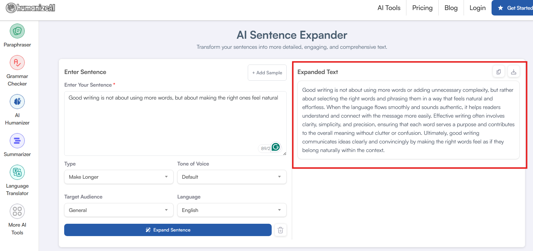 Pricing: This multilingual AI Sentence Expander by HumanizeAI.io is free to use and offers unlimited attempts for any given mode.