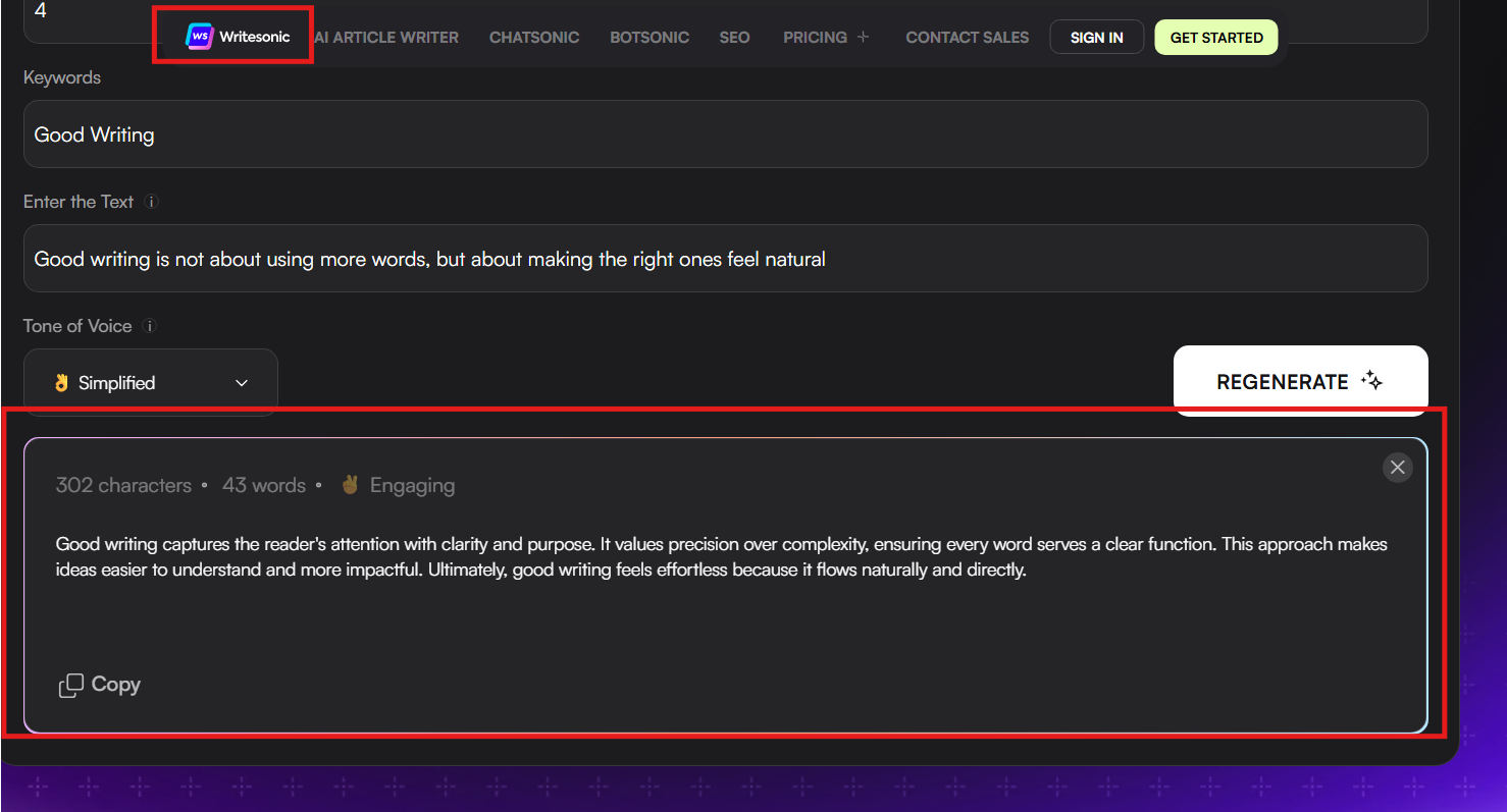 - WriteSonic doesn’t shift from the original context as it expands our sentence.